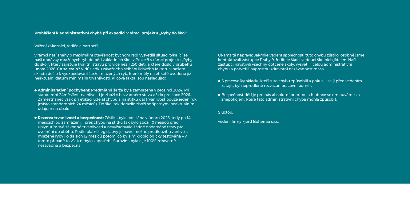 FJORD BOHEMIA je jedním z největších zpracovatelů ryb ve střední Evropě. Od svého založení poskytujeme komplexní řešení pro dodávky chlazených i mražených ryb a mořských plodů. Naše moderní výrobní a logistické zázemí o ploše 5 000 m² se nachází na severním okraji Prahy, což nám umožňuje efektivní distribuci napříč Evropou. Naším cílem je poskytovat produkty nejvyšší kvality při dodržování principů udržitelnosti a odpovědnosti vůči životnímu prostředí. V e-shopu FJORD BOHEMIA se můžete spolehnout na výběr těch nejkvalitnějších ryb přímo z moře na váš stůl. Naše čerstvé ryby jsou pečlivě vybírány a dodávány tak, aby si zachovaly svou jedinečnou chuť a všechny důležité živiny. V naší nabídce naleznete širokou škálu ryb, které uspokojí i ty nejnáročnější chutě.