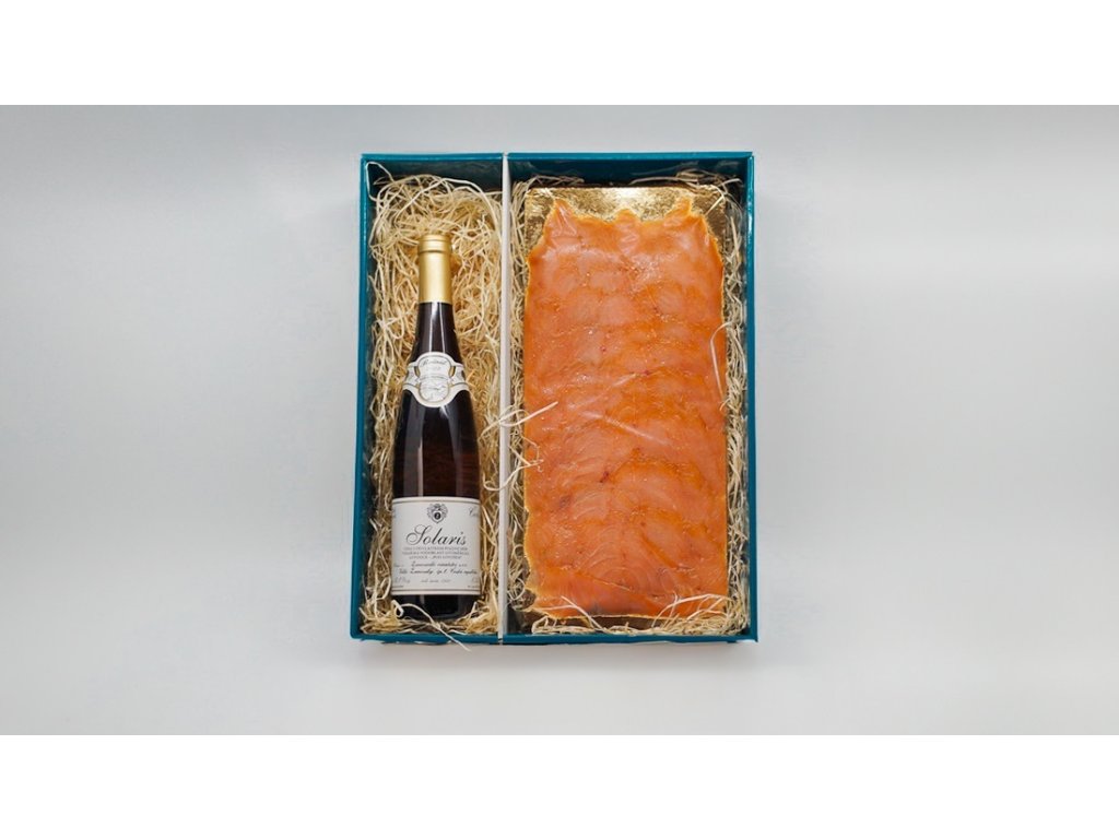 Luxusní dárkové balení Premium od Fjord Bohemia spojuje dvě výjimečné delikatesy – jemně uzeného lososa a ušlechtilé bílé víno z Velkých Žernosek. Losos vyniká hedvábnou texturou a delikátní chutí, která se dokonale doplňuje se svěžími ovocnými tóny vína. Společně tvoří harmonii chutí, jež povyšuje každé setkání na gurmánský zážitek.