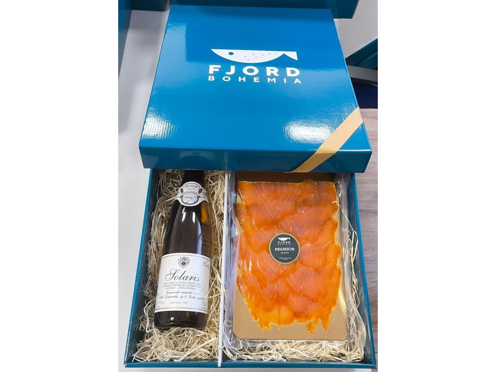 Dárkové luxusní balení s vínem + uzený plátkovaný losos Fjord Bohemia Premium