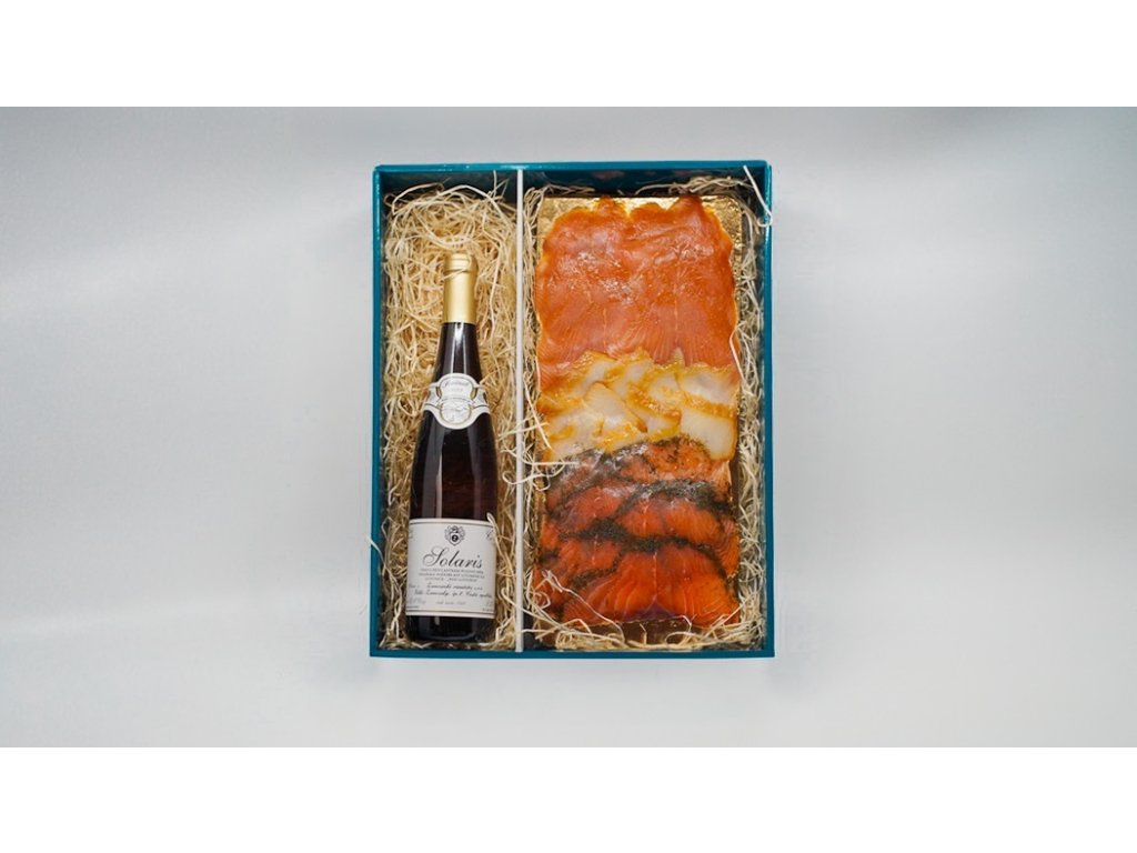 Luxusní dárkové balení Premium od Fjord Bohemia spojuje dvě výjimečné delikatesy – jemně uzeného lososa a ušlechtilé bílé víno z Velkých Žernosek. Losos vyniká hedvábnou texturou a delikátní chutí, která se dokonale doplňuje se svěžími ovocnými tóny vína. Společně tvoří harmonii chutí, jež povyšuje každé setkání na gurmánský zážitek.