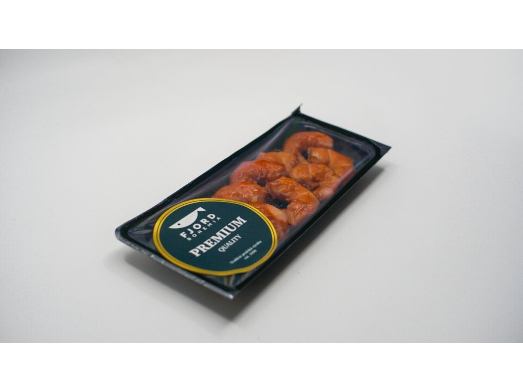 Loupané krevety uzené za tepla, balení 0,1 kg, chlazené, balené v ochranné atmosféře MAP. Výrazná uzená chuť a pevná textura, ideální pro studenou kuchyni i rychlé servírování.