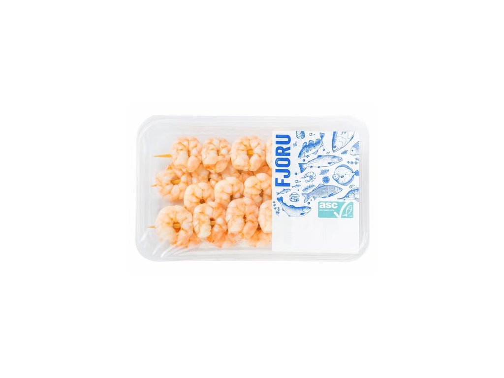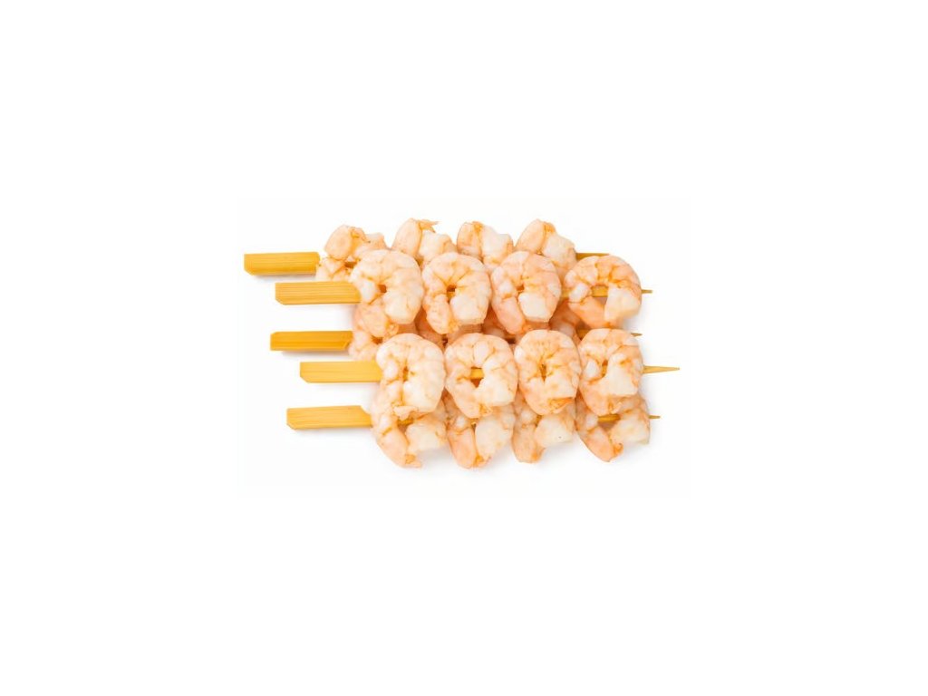 Loupané vařené krevety na špízu s certifikací ASC. Prakticky naporcovaný produkt s jemnou chutí, ideální pro grilování, studenou kuchyni i rychlé servírování.