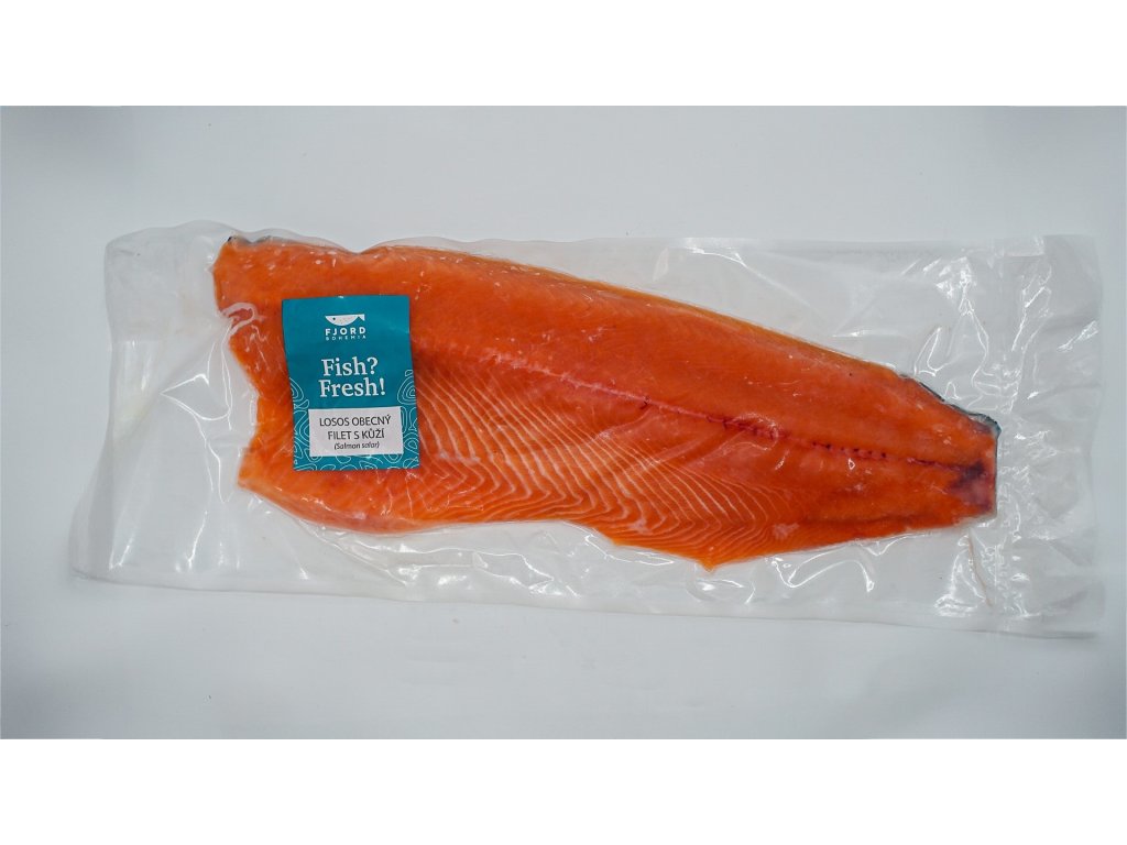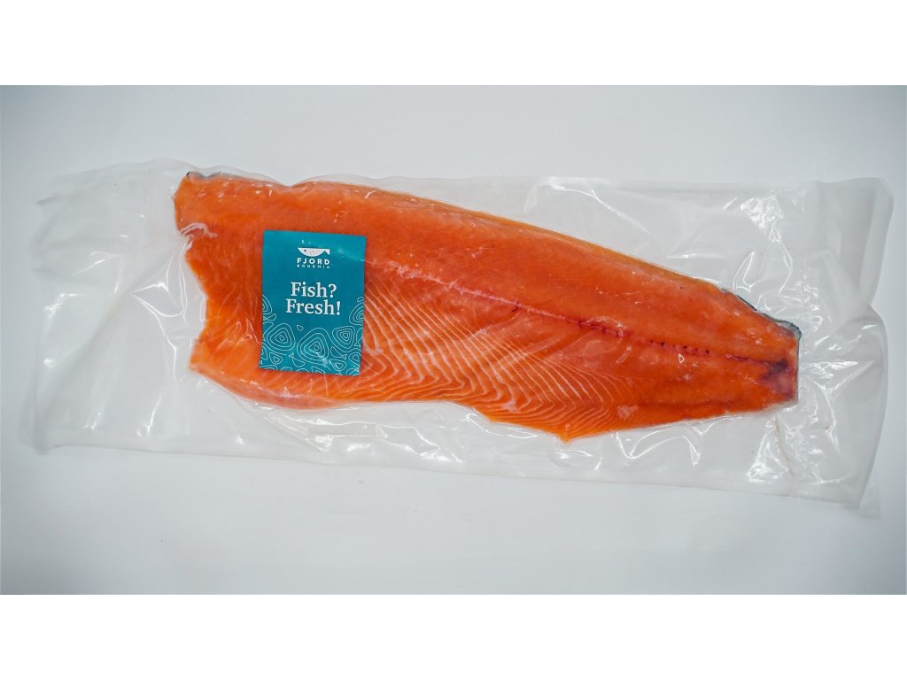 Mražený filet lososa obecného v úpravě D-trim, bez kostí a s kůží. Vákuově balený, hmotnost 1,7–2,0 kg. Vhodný pro teplou kuchyni i profesionální gastronomii.