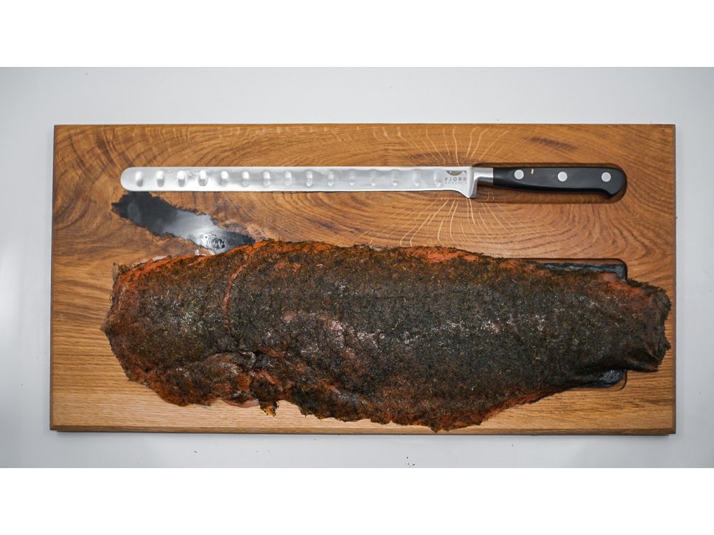 Marinovaný plátkovaný losos obecný s koprem, bez kůže, vakuově balený, 1 kg. Jemná chuť čerstvého kopru a kvalitního lososa, ideální pro studenou kuchyni i gastronomické využití.