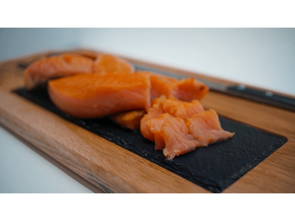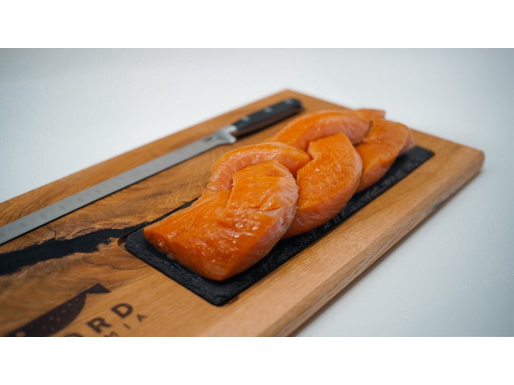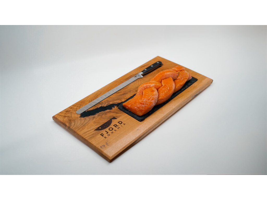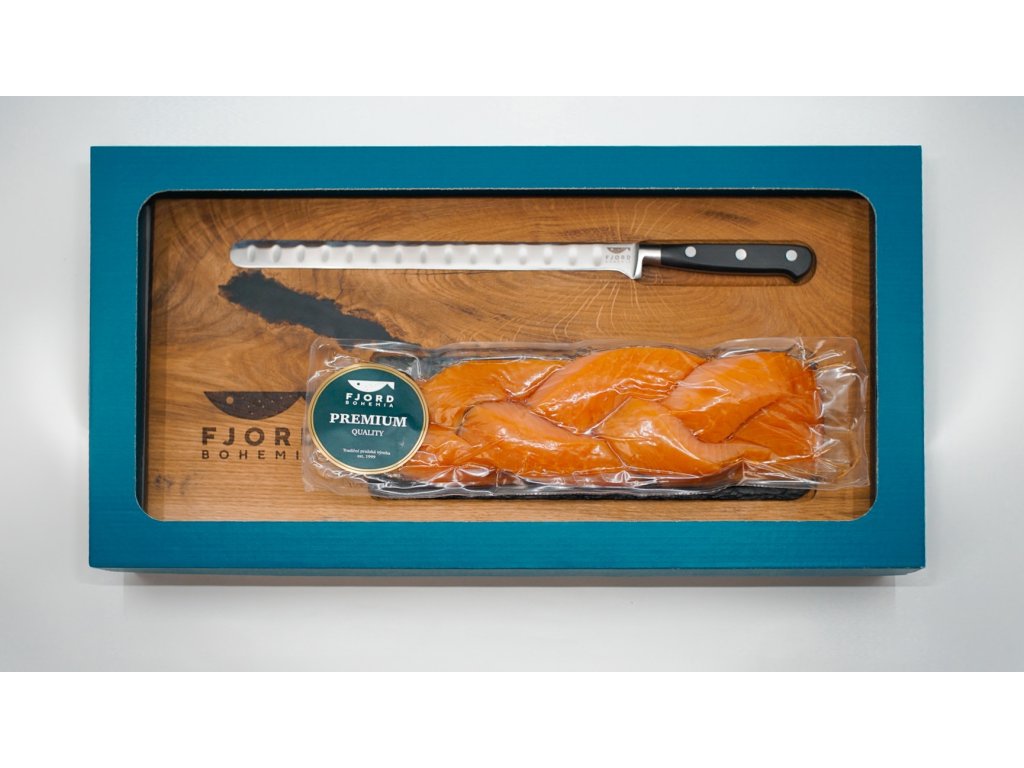 Exkluzivní dárkové balení Losos Vánočka doplněné o elegantní dřevěné prkénko a nůž. Ideální pro sváteční stůl, gurmány i jako reprezentativní dárek.