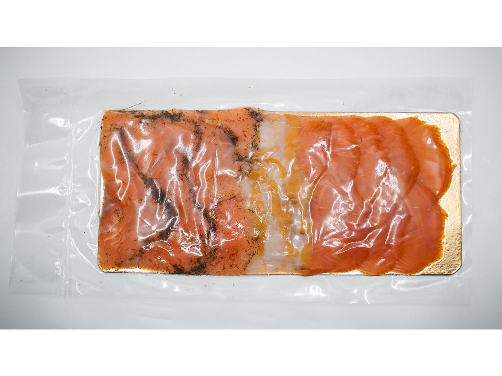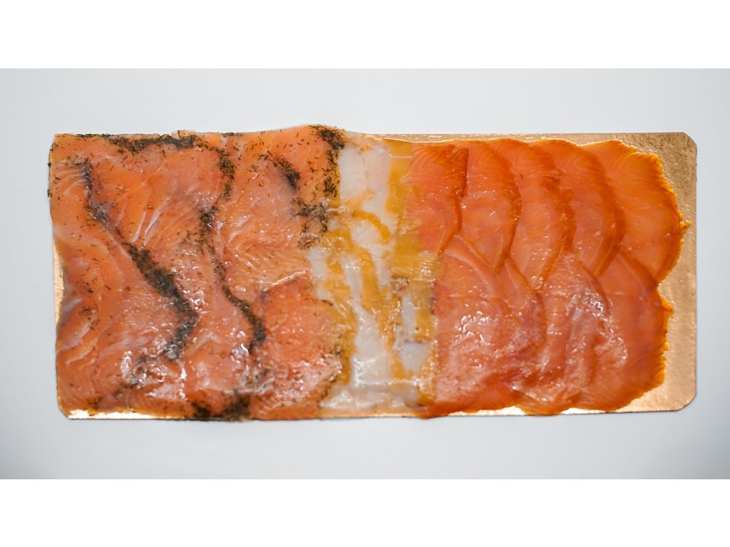 Plátky uzeného, marinovaného lososa a uzeného halibuta, cca 500 g. Kombinace jemně uzeného lososa a halibuta s marinovanou chutí, ideální pro studenou kuchyni, saláty nebo sendviče. Bohaté na omega-3 mastné kyseliny a bílkoviny.